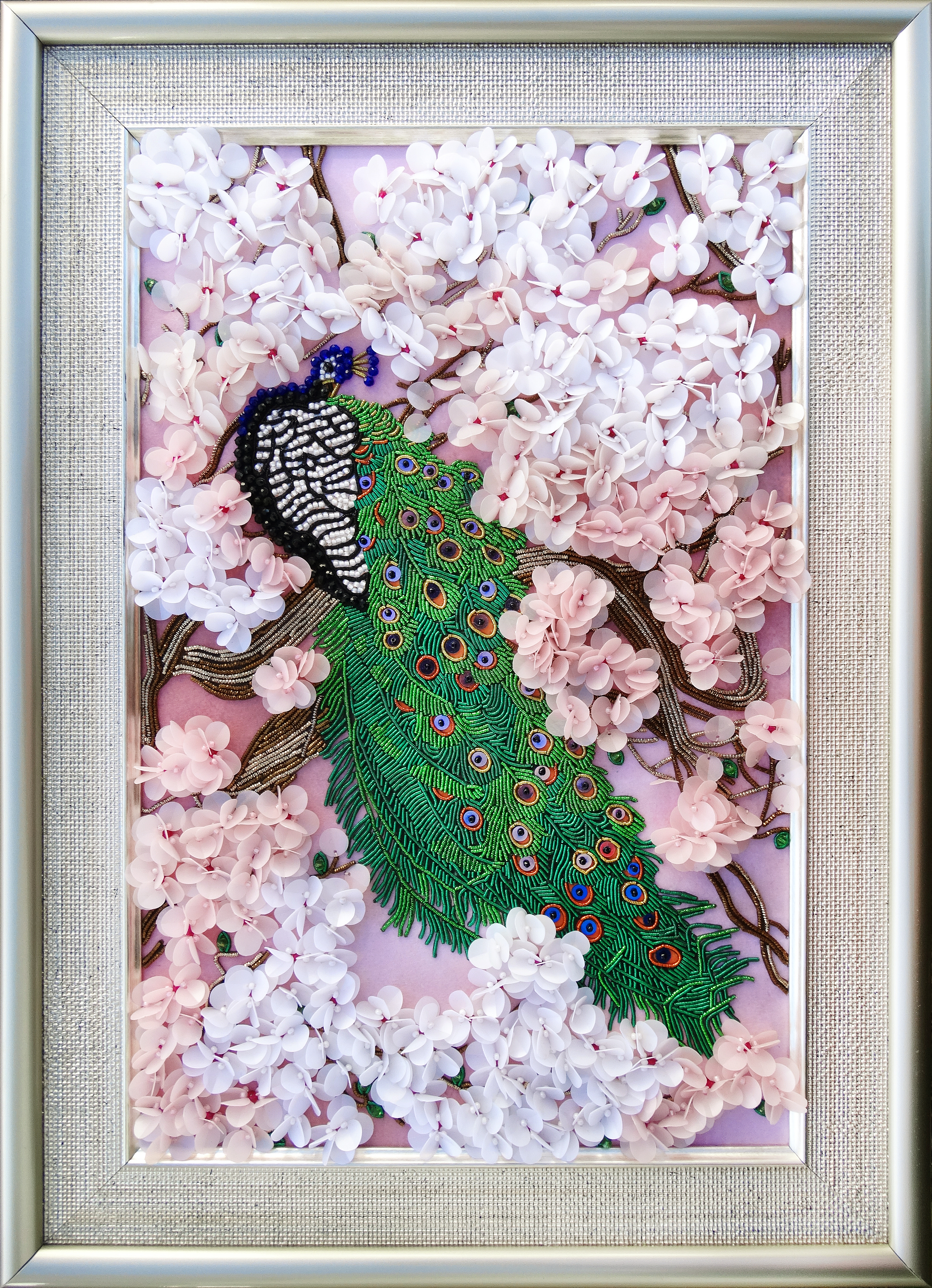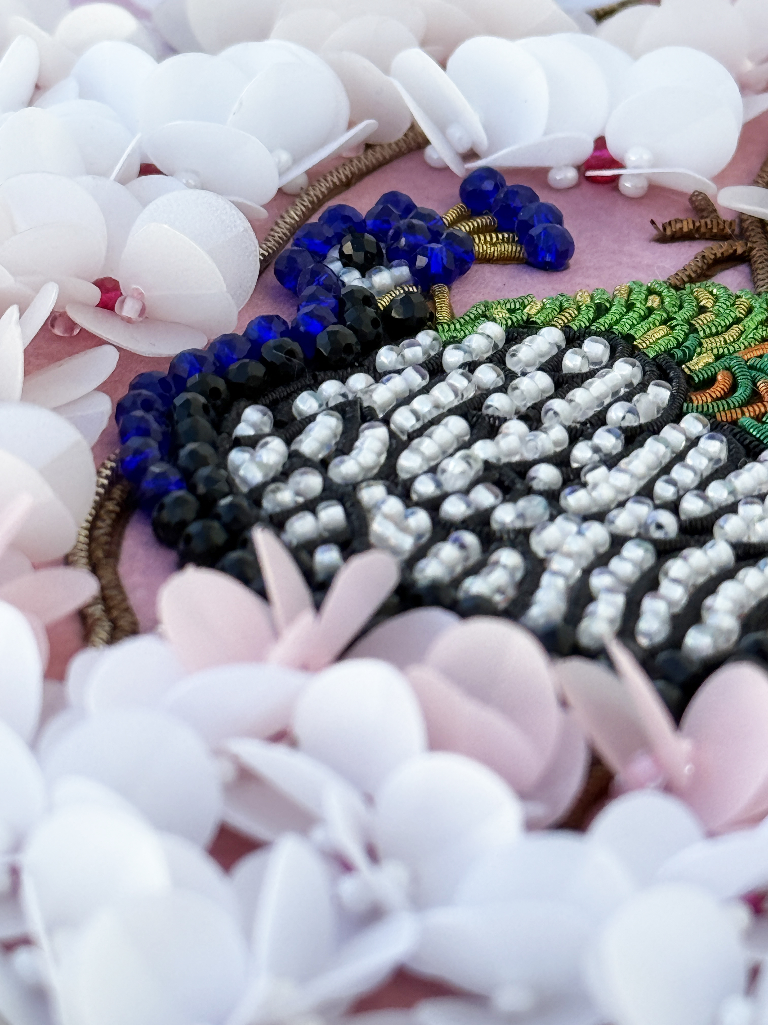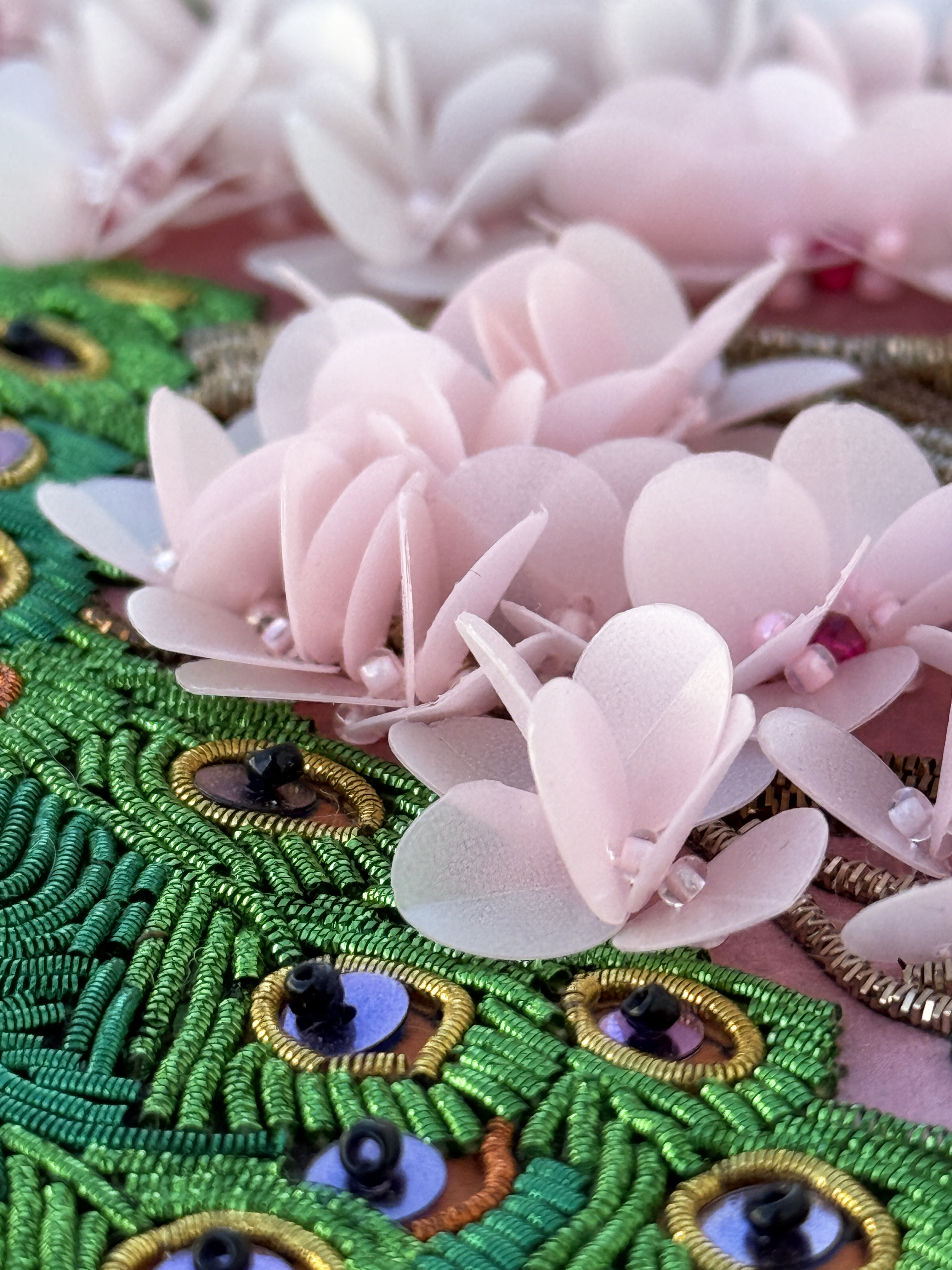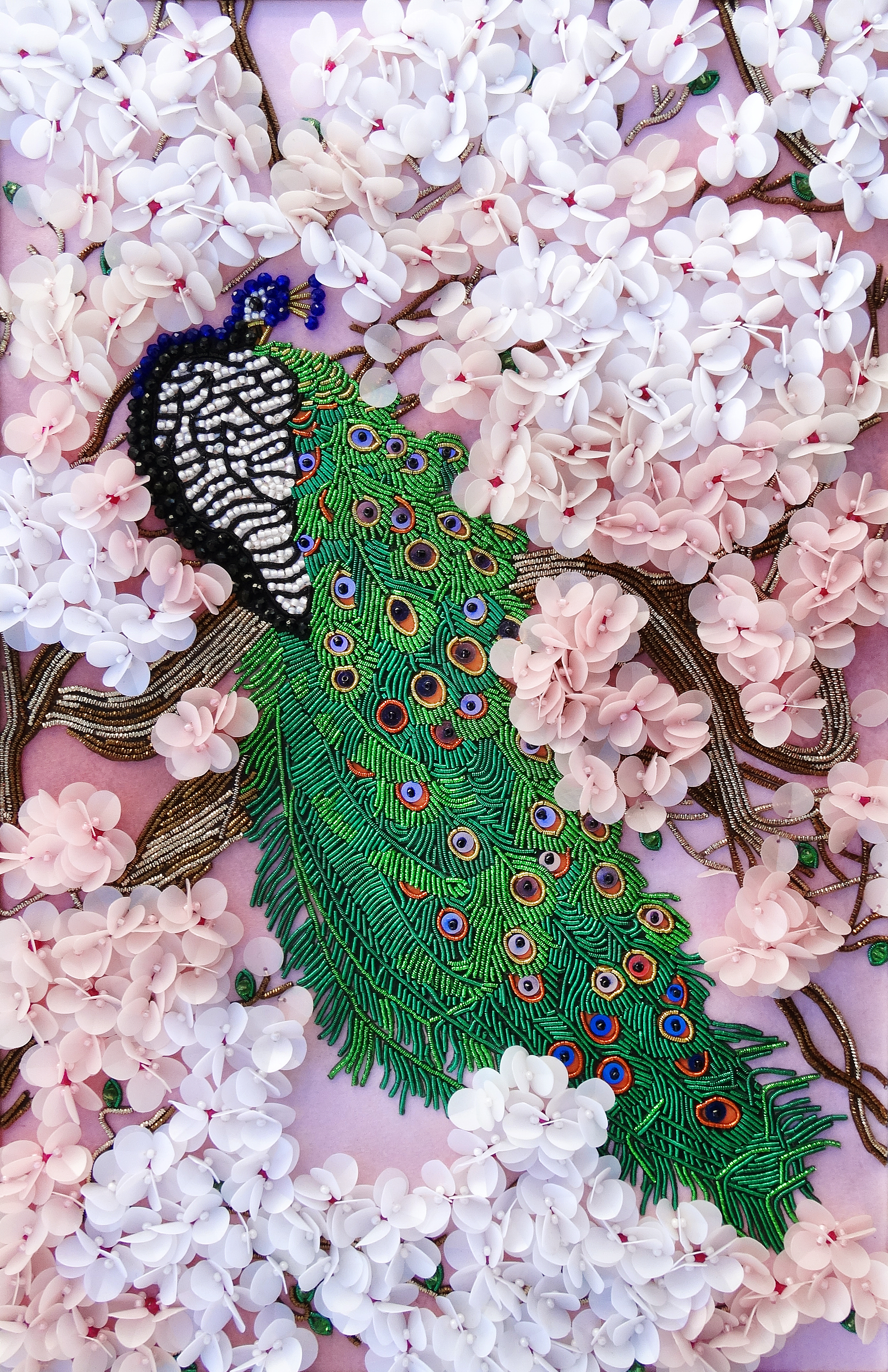 Особенная сюжетная разработка от нашей студии вышивки, впервые мы попробовали увеличить объем своих сюжетов и не прогадали, пайетки-лепестки отлично имитируют цветение сакуры, создавая ощущение наступившей весны.