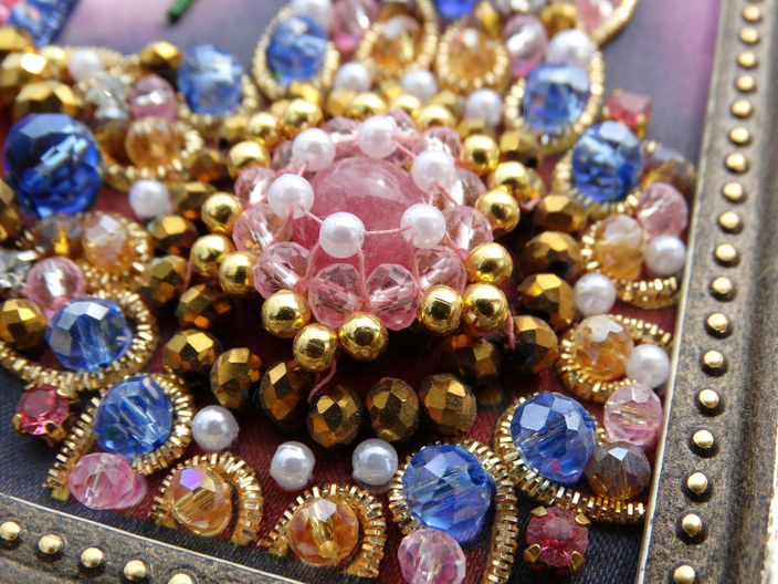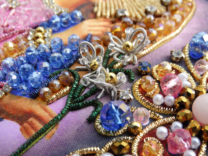 В наборе Вам встретится большое количество качественных материалов: хрустальные бусины разных расцветок и размеров, хрустальные стразы, трунцал, также в разных расцветках и размерах, бисер, бусины из природного камня, стразовые цепочки (ленты). Авторская схема наносится на атласную ткань, эта ткань прекрасно протыкается иглой, не деформируется, отлично выдерживает вес хрустальных камней. Также в набор входит подробная инструкция, в ней описаны не только все способы пришивания материалов, входящих в набор, но и показаны на пошаговых фотографиях. Ну и конечно же в набор входит подходящая игла.