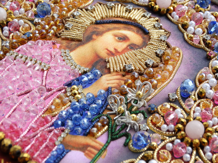 Наши наборы отличаются большим количеством техник, знание которых понадобится Вам для вышивки. В именных иконах впервые представлены новые для наших наборов элементы плетения. Крупная бусина по центру оплетается другими: хрустальными, металлическими и акриловыми бусинами. Форма и дизайн плетения, которое Вы видите на фото слева, разработали мы сами, это наша уникальная разработка. Пусть это занятие и кажется сложным, на самом деле, такая работа интересна и увлекательна!