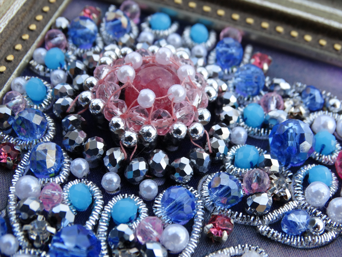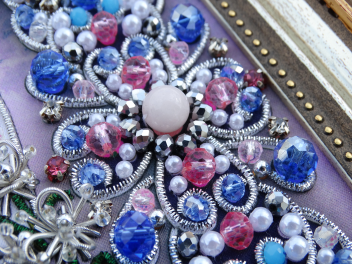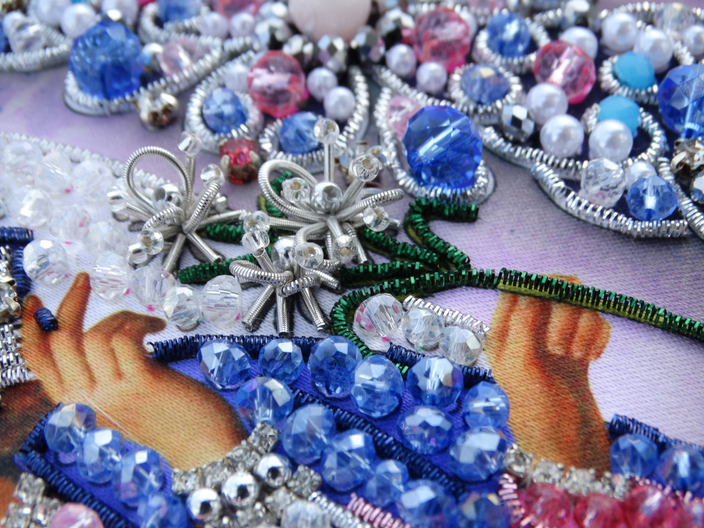 В наборе Вам встретится большое количество качественных материалов: хрустальные бусины разных расцветок и размеров, хрустальные стразы, трунцал, также в разных расцветках и размерах, бисер, бусины из природного камня, стразовые цепочки (ленты). Авторская схема наносится на атласную ткань, эта ткань прекрасно протыкается иглой, не деформируется, отлично выдерживает вес хрустальных камней. Также в набор входит подробная инструкция, в ней описаны не только все способы пришивания материалов, входящих в набор, но и показаны на пошаговых фотографиях. Ну и конечно же в набор входит подходящая игла.