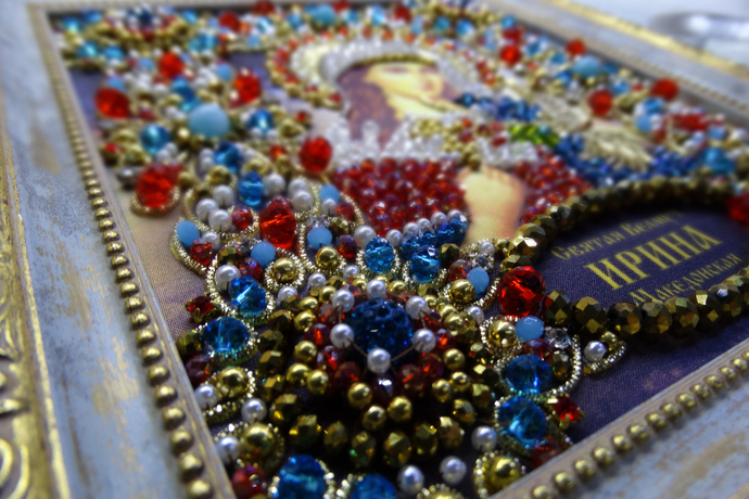 Все наши именные иконы отличаются особым разнообразием материалов для рукоделия. Состав набора: хрустальные бусины и стразы, акриловые и металлические бусины, трунцал, бусины из полимерной глины и хрустальных страз, природный камень, игла для вышивания. На плотную атласную ткань наносится авторская схема, а подробная инструкция содержит в себе большое количество пошаговых фотографий и схем, которые помогут даже неопытной вышивальщице вышить настоящий шедевр.