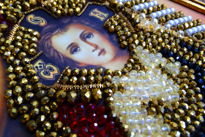 Размер готовой работы 23,5 х 30,5 см. Это среднего размера вышивка: такую можно разместить как в домашнем иконостасе, так и подарить церкви. Цветовая гамма работы полнится золотыми и бордовыми бусинами, именно в таком цветовом исполнении, как правило, мы видим и представляем Казанскую Богородицу. Но, при этом вышивка выполнена в светлых тонах, благодаря бежевому фону, нанесенному на ткань, светло-желтым бусинам и, конечно же, жемчужным бусинам цвета слоновой кости. По окончании вышивки мы получаем нежный, светлый Образ Казанской Богородицы.