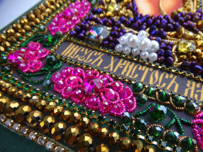 Размер готовой работы 30 х 41 см. Это вышивка среднего или даже крупного размера: такую можно разместить как в домашнем иконостасе, так и подарить церкви. Цветовая гамма работы полнится зелеными и фиолетовыми бусинам, работа выполнена в темных оттенках, чтобы сделать главный акцент на жемчужных бусинах. Ключевую роль в данной работе занимает Лоза, являющаяся как будто продолжением руки Христа, а также невероятного богатства обрамление нимба с ангелами.