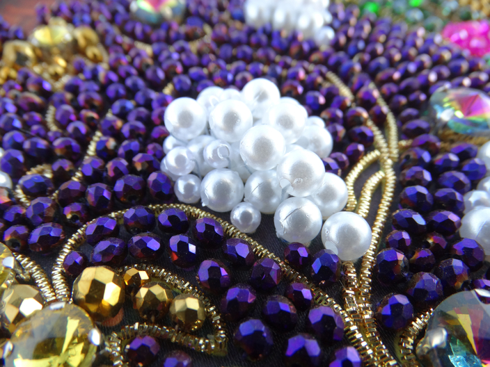 В наборе Вам встретится большое количество качественных материалов: хрустальные бусины разных расцветок и размеров, хрустальные стразы, трунцал, также в разных расцветках и размерах, бисер, металлические корзинки для бусин, стразовые цепочки, акриловый жемчуг. Авторская схема наносится на атласную ткань, эта ткань прекрасно протыкается иглой, не деформируется, отлично выдерживает вес хрустальных камней. Также в набор входит подробная инструкция, в ней описаны не только все способы пришивания материалов, входящих в набор, но и показаны на пошаговых фотографиях. Ну и конечно же в набор входит подходящая игла.