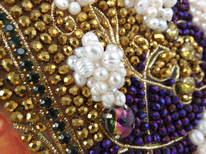 В наборе Вам встретится большое количество качественных материалов: хрустальные бусины разных расцветок и размеров, хрустальные стразы, трунцал, также в разных расцветках и размерах, бисер, металлические корзинки для бусин, стразовые цепочки, натуральный речной жемчуг. Авторская схема наносится на атласную ткань, эта ткань прекрасно протыкается иглой, не деформируется, отлично выдерживает вес хрустальных камней. Также в набор входит подробная инструкция, в ней описаны не только все способы пришивания материалов, входящих в набор, но и показаны на пошаговых фотографиях. Ну и конечно в набор входит подходящая игла.