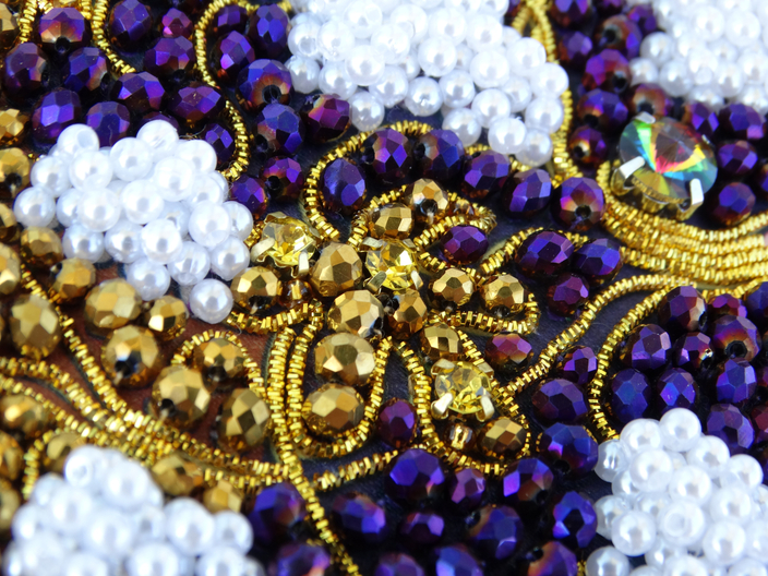 В наборе Вам встретится большое количество качественных материалов: хрустальные бусины разных расцветок и размеров, хрустальные стразы, трунцал, также в разных расцветках и размерах, бисер, металлические корзинки для бусин, стразовые цепочки, акриловый жемчуг. Авторская схема наносится на атласную ткань, эта ткань прекрасно протыкается иглой, не деформируется, отлично выдерживает вес хрустальных камней. Также в набор входит подробная инструкция, в ней описаны не только все способы пришивания материалов, входящих в набор, но и показаны на пошаговых фотографиях. Ну и конечно же в набор входит подходящая игла.