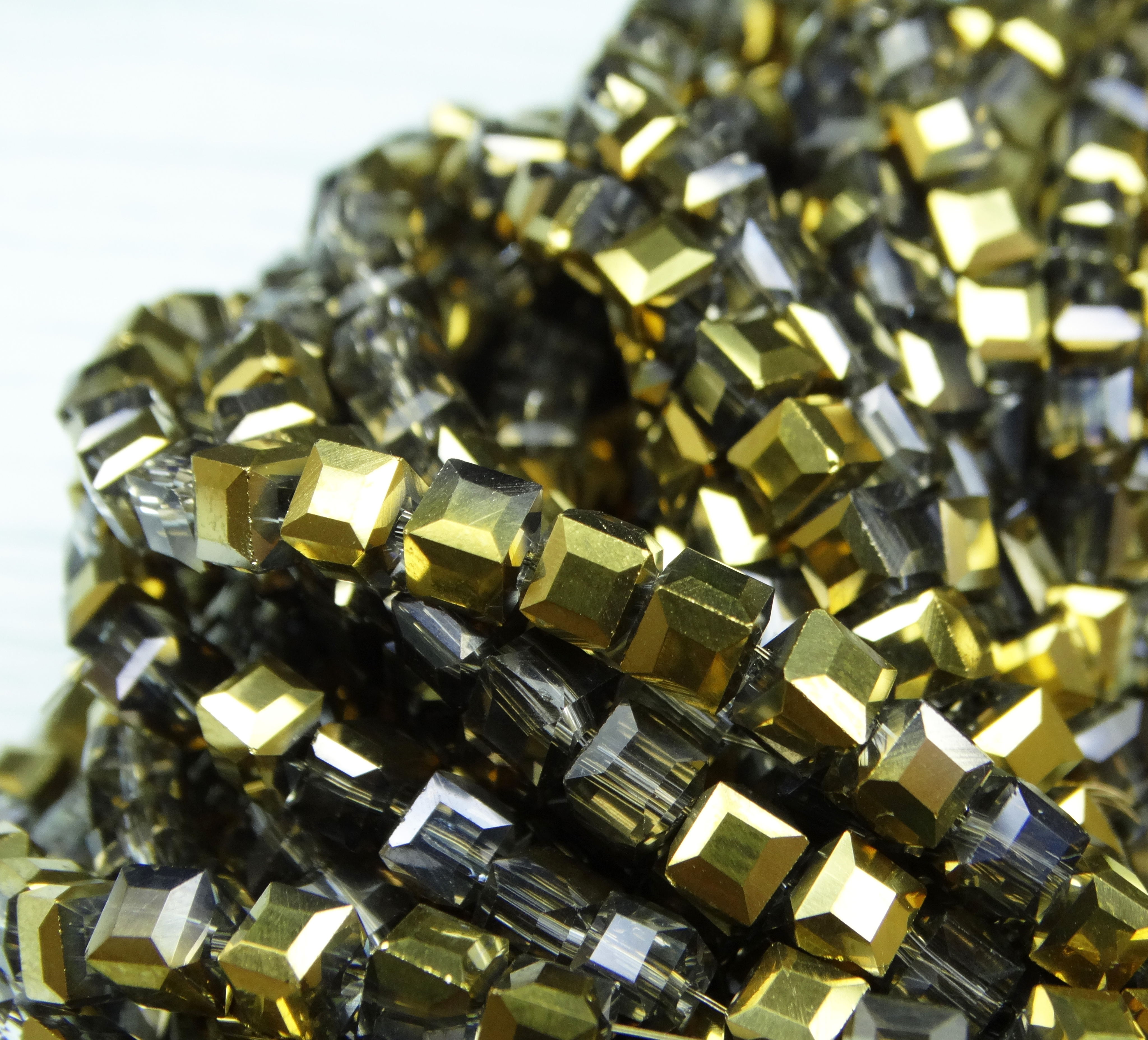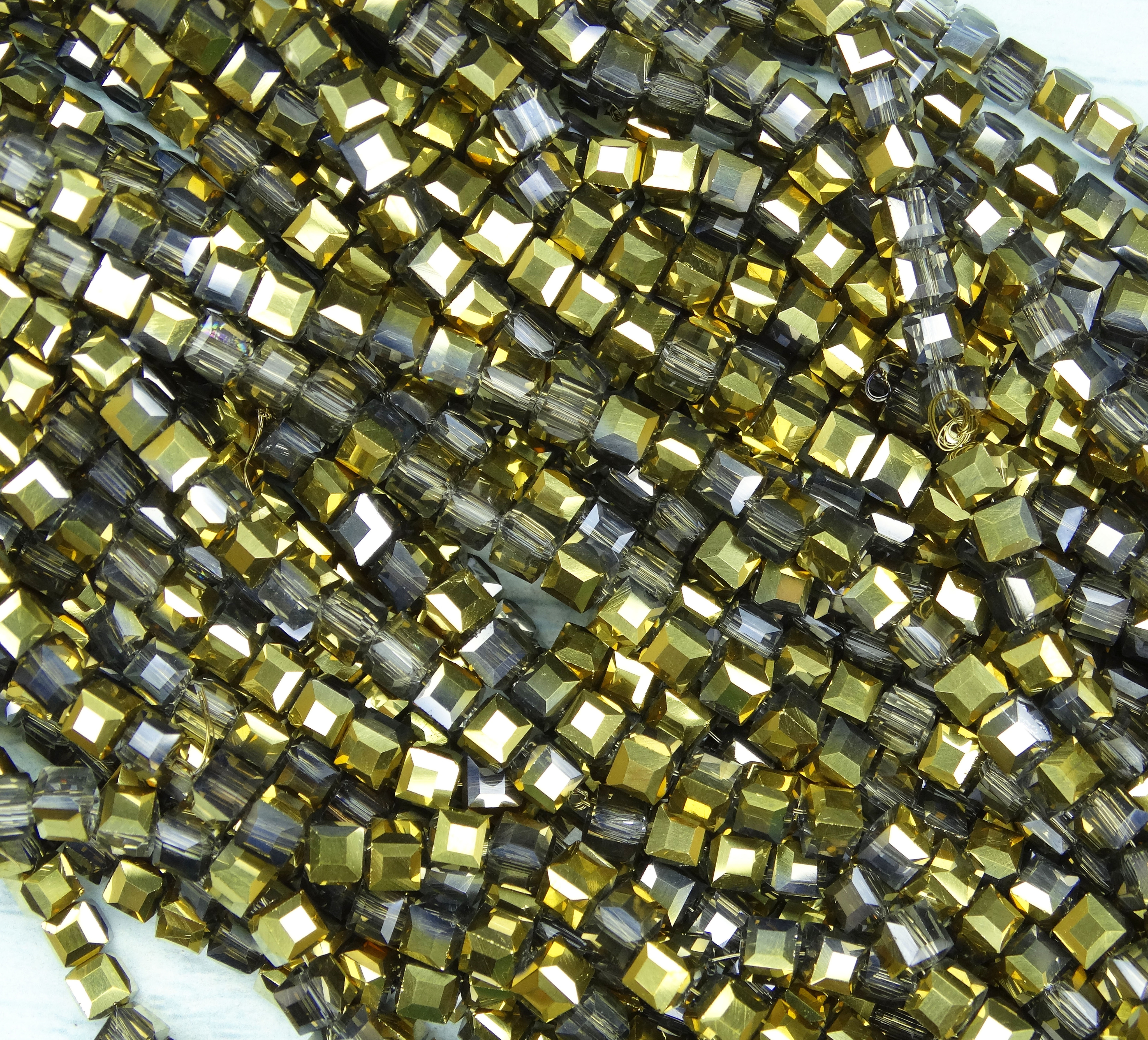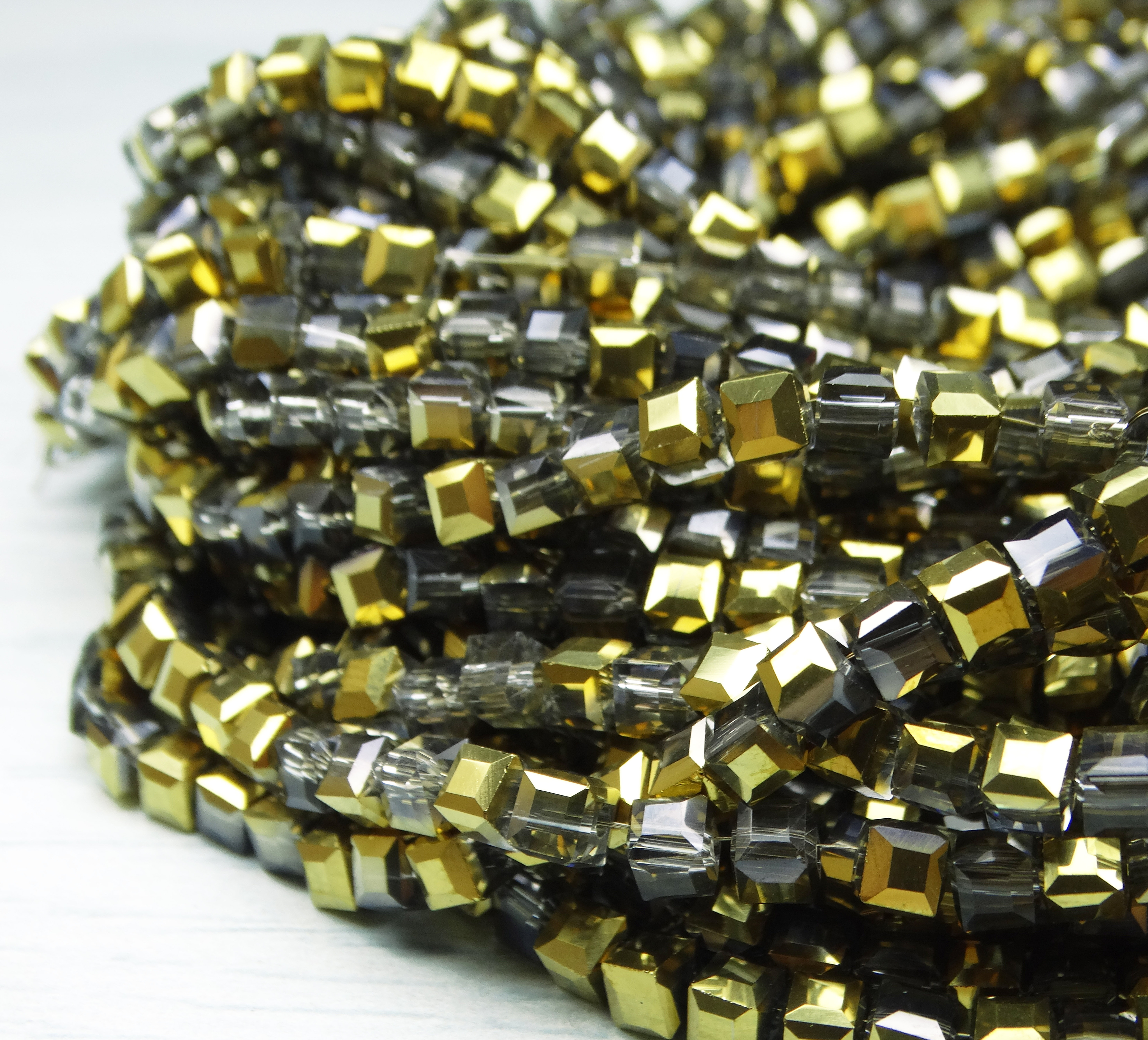 БВ054ДН4 Хрустальные бусины квадратные, прозрачный с золотым металлик AB, 4 мм, кол-во: 44-45 шт.
