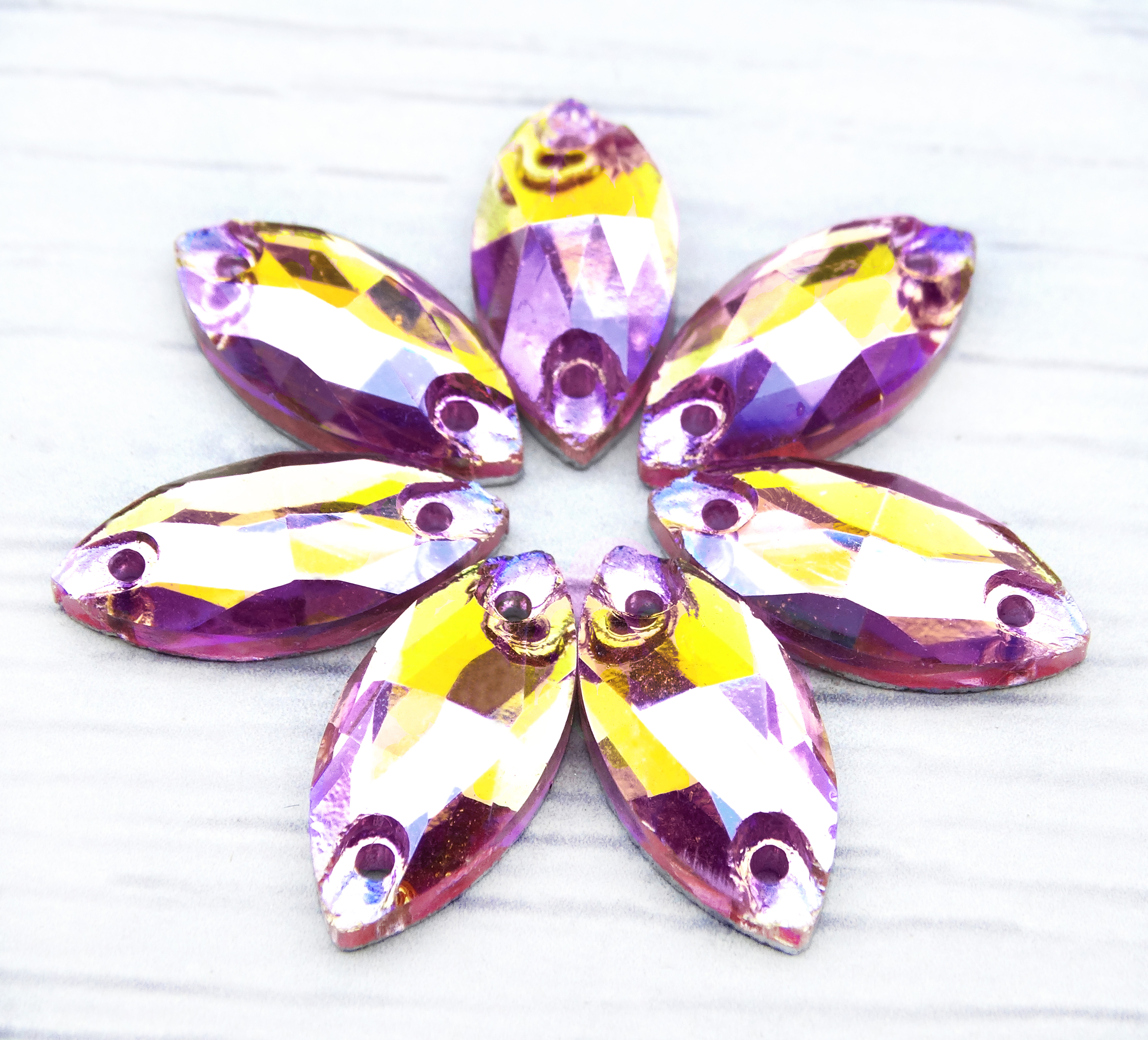Предупреждение! AB покрытие на хрустальных стразах очень неустойчиво к механическим повреждениям, в связи с этим на стразах допустимы небольшие повреждения AB покрытия (потертости).